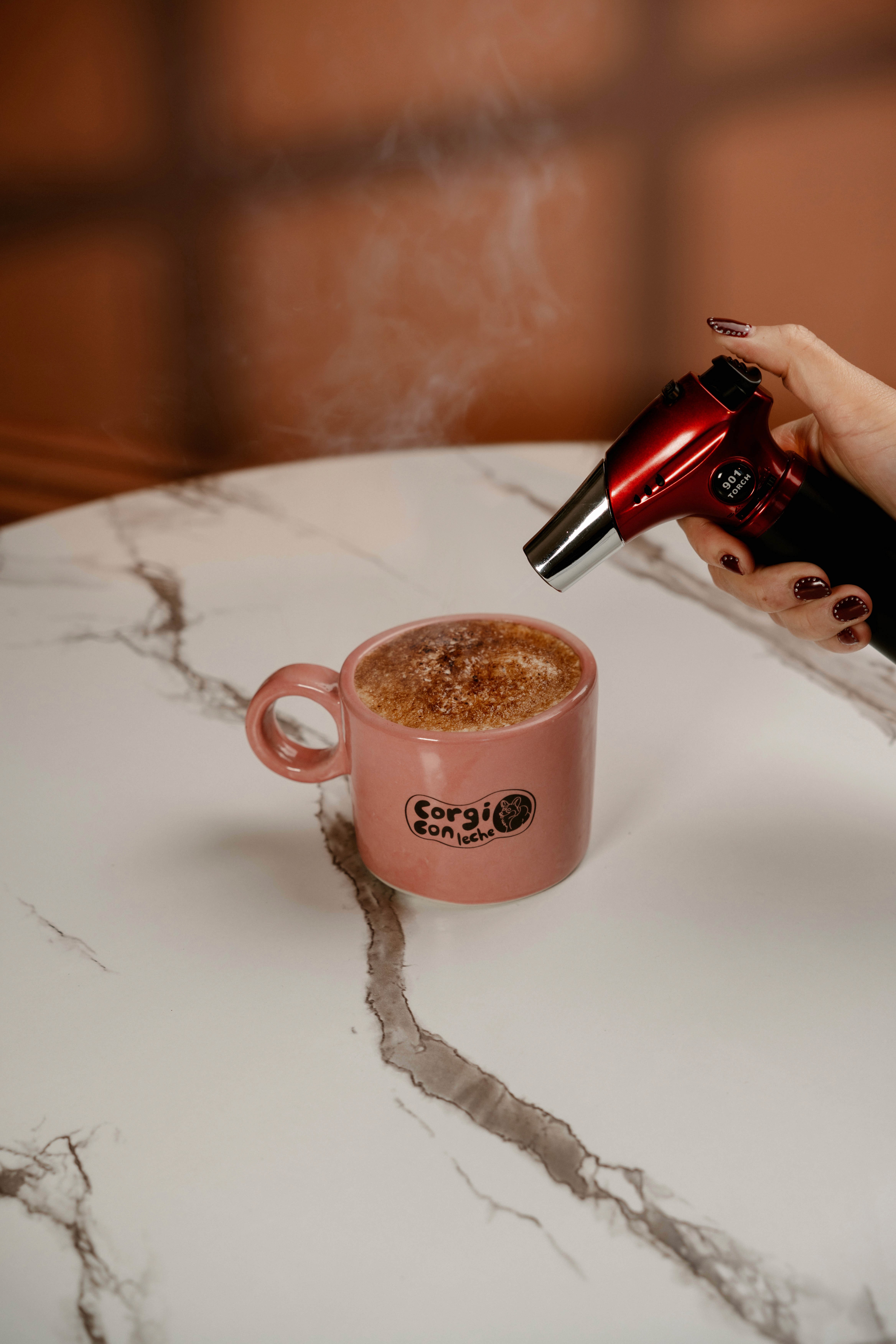 Latte personalizado a tu gusto, finalizado con un toque dulce y crujiente de creme brulee.